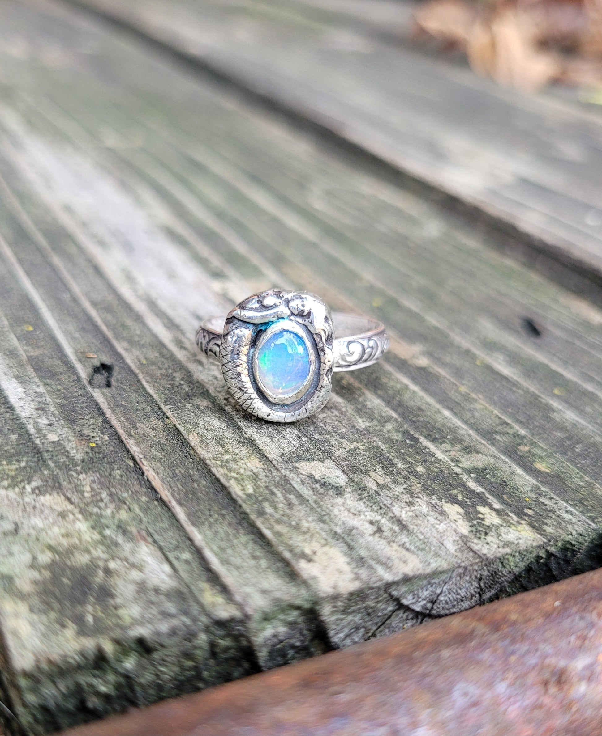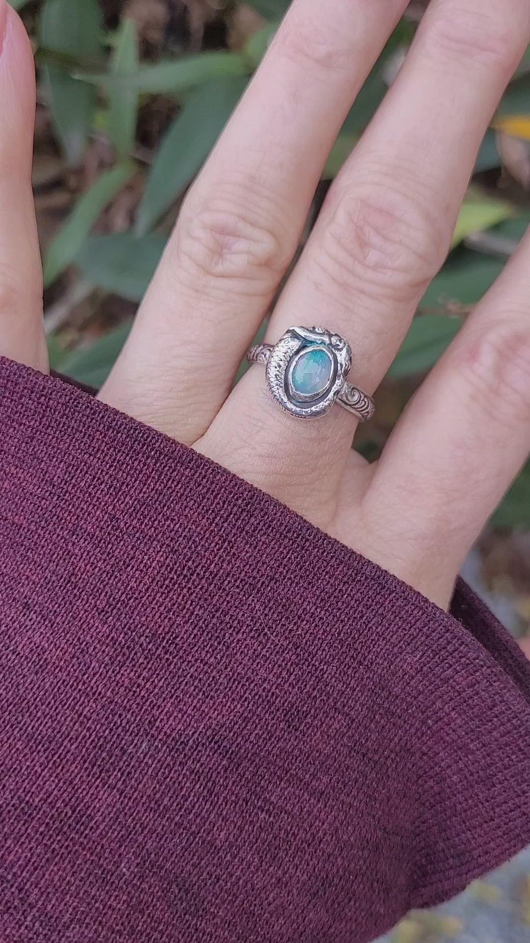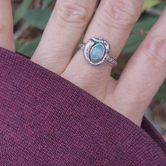 Dainty and sweet sterling silver mermaid ring with opal gemstone. She oh so elegantly wrapped around the stone with her flowing locks draping down.